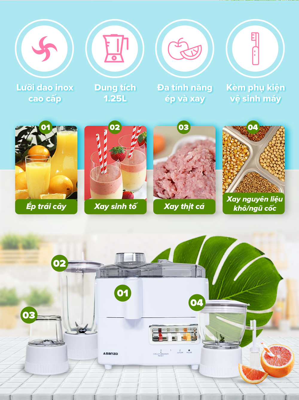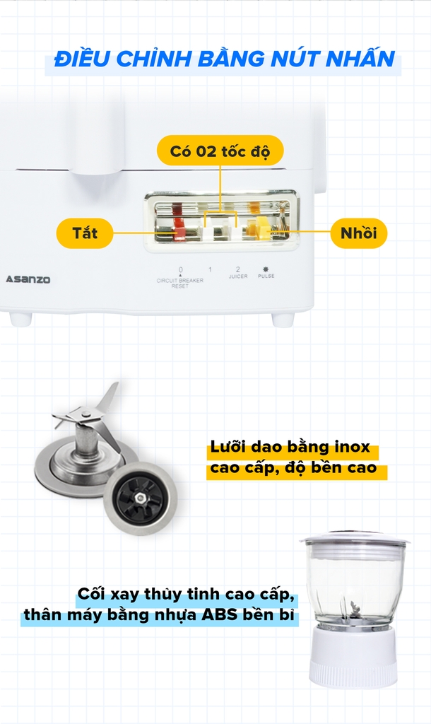 - Chất liệu cối: nhựa kháng vỡ - Lưỡi dao bằng inox cao cấp - Có cối xay nguyên liệu khô - Điều chỉnh bằng nút nhấn điện tử, có 2 tốc độ - Thiết kế đèn Led xung quanh nút hoạt động - Hệ thống an toàn khi quá nhiệt, đế nhiệt ABS