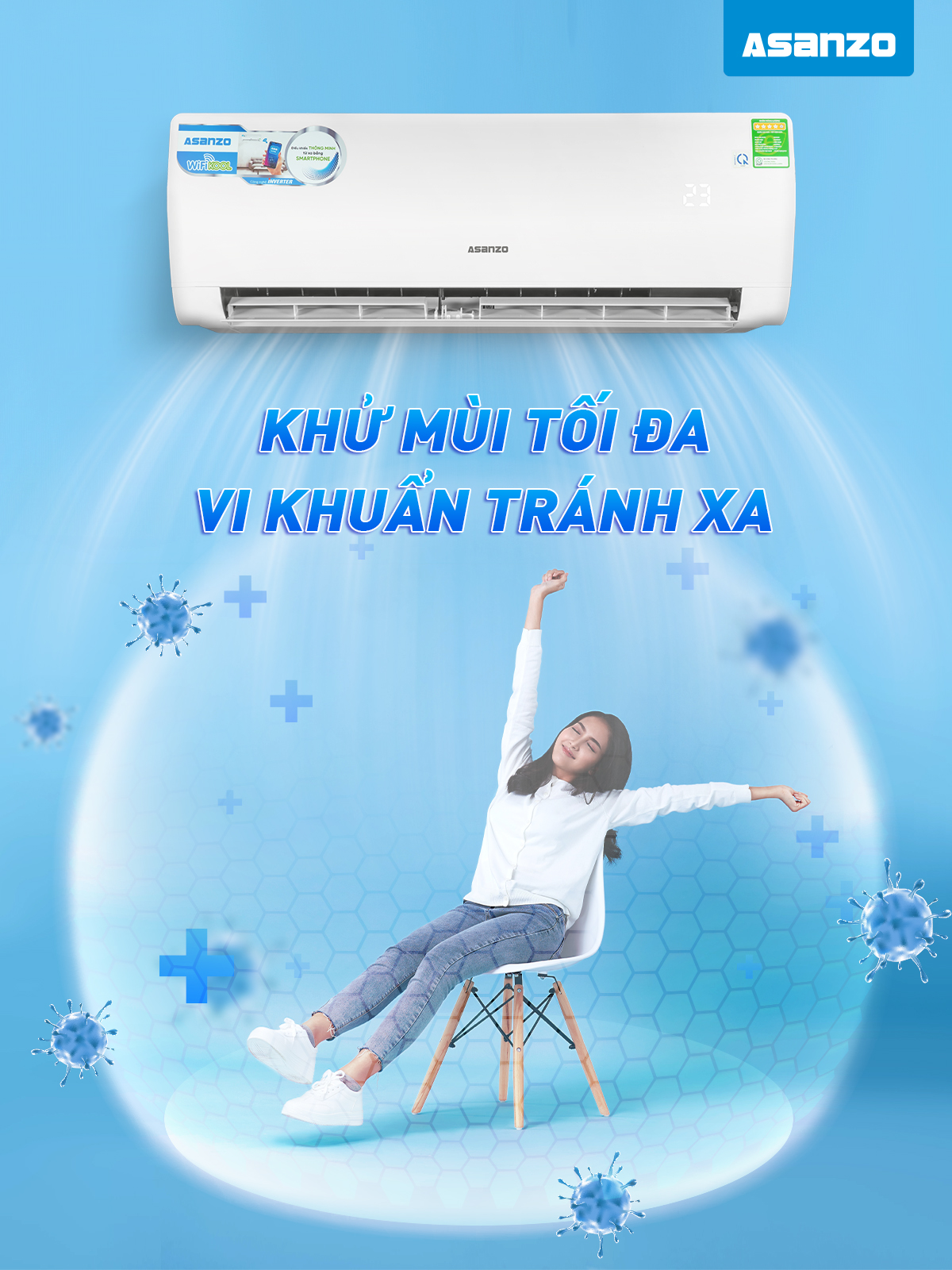 Để mùi hôi trong phòng không còn là nỗi lo, bạn hãy đầu tư ngay cho gia đình một chiếc điều hòa Asanzo Inverter. Với công nghệ Nano-Silver hiện đại không chỉ giúp bạn loại bỏ mùi hôi, ẩm mốc hiệu quả mà còn tiêu diệt hơn 650 loại vi khuẩn gây hại có trong không khí tạo nên không gian trong lành, sạch khuẩn cho căn phòng.