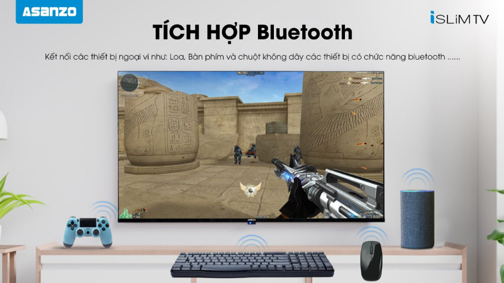 - Tivi sử dụng Remote thông minh tích hợp Chuột bay, Voice Search, Google Assistant đồng thời có thể điều khiển Tivi thông qua mắt hồng ngoại và cả điều khiển qua Bluetooth (Tên Bluetooth là: ASG RC)